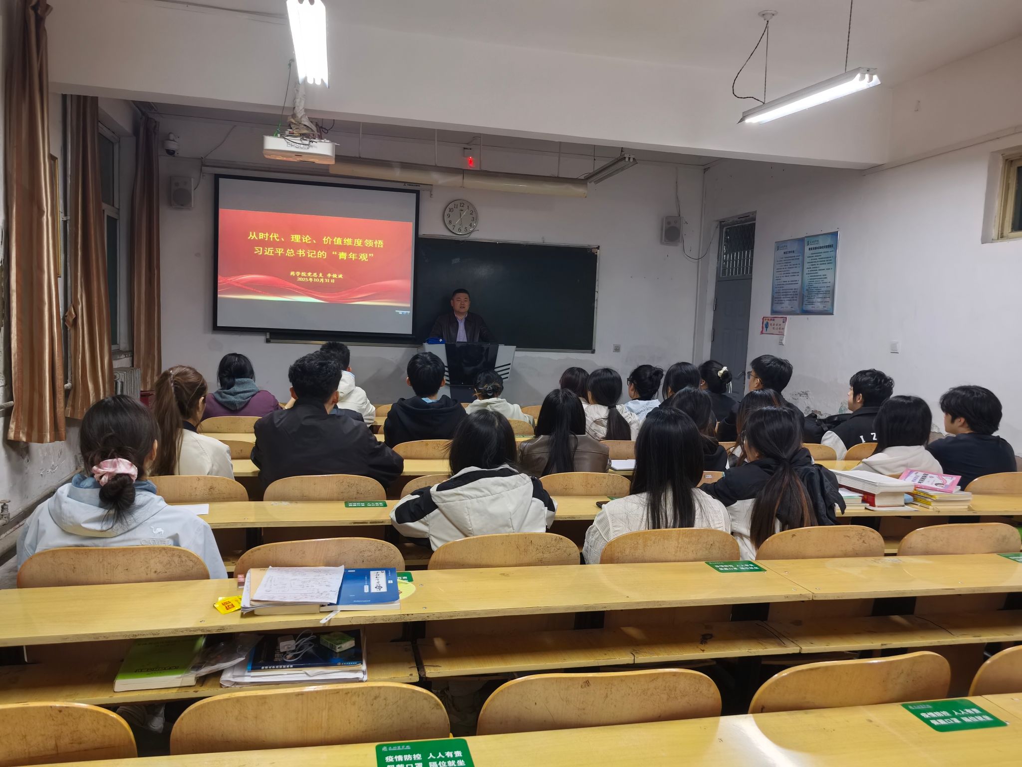 为深入贯彻落实《山西省高校党建工作规范提升专项行动方案》要求,持续增进青年学生对党的创新理论的政治认同、思想认同、理论认同与情感认同,10月31日晚,药学院党总支组织青年学习小组开展集体学习。党总支书记李俊波以《从时代、理论、价值维度领悟习近平总书记的“青年观”》为题讲授专题党课,青年学习小组全体学生党员、入党积极分子参加学习。
